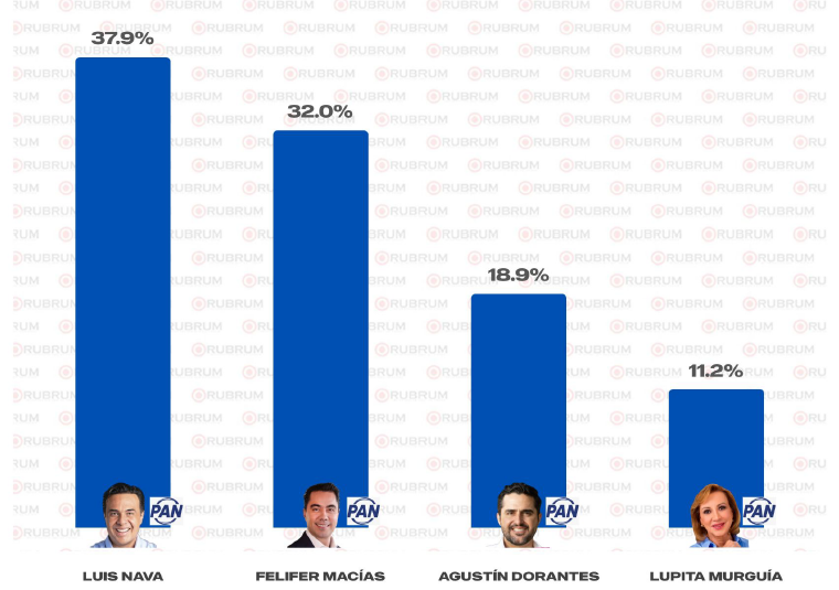 En el escenario estatal, Luis Nava y Felifer Macías, ambos identificados con el PAN, aparecen en los primeros lugares de intención de voto con 37.9% y 32% respectivamente. La encuesta los coloca por encima de los aspirantes de Morena, quienes se ubican en una segunda posición, con una diferencia de hasta 18 puntos que refleja un margen relevante a favor del blanquiazul.